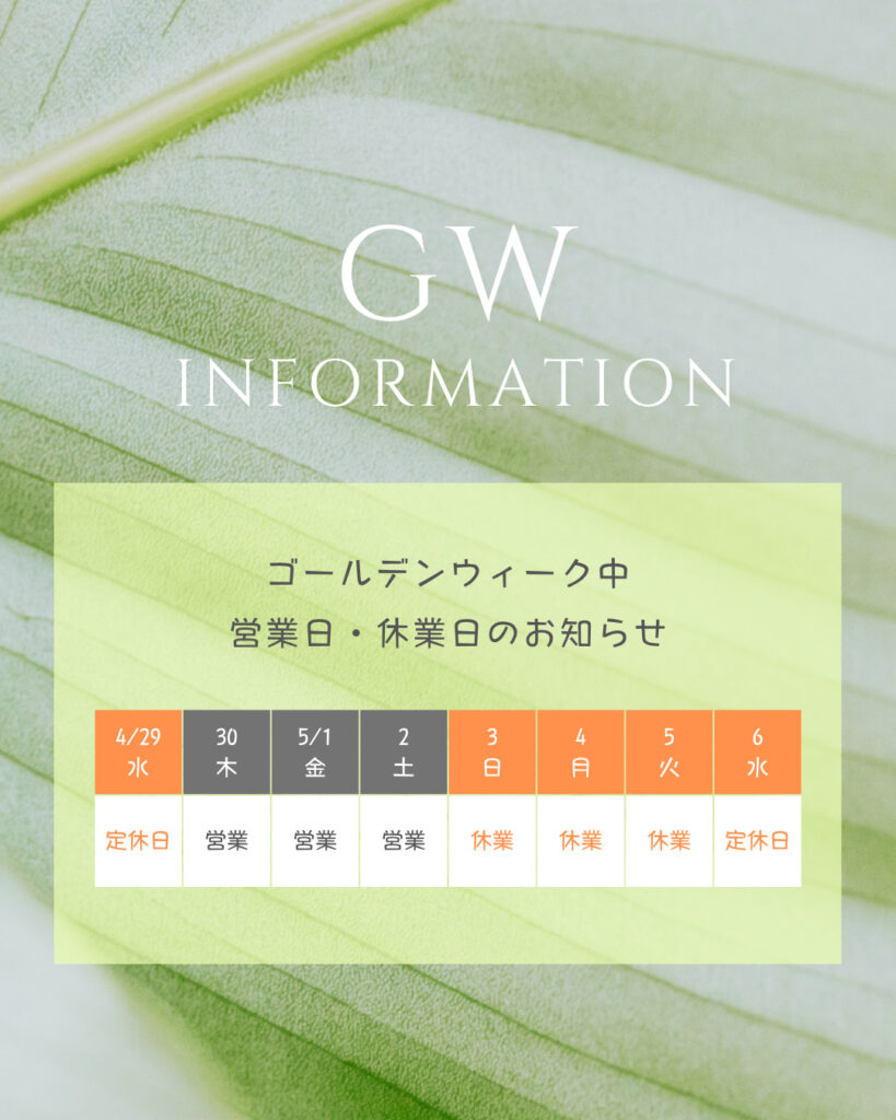 誠に勝手ながら、ゴールデンウィーク期間中は毎週水曜日の定休日に加えまして