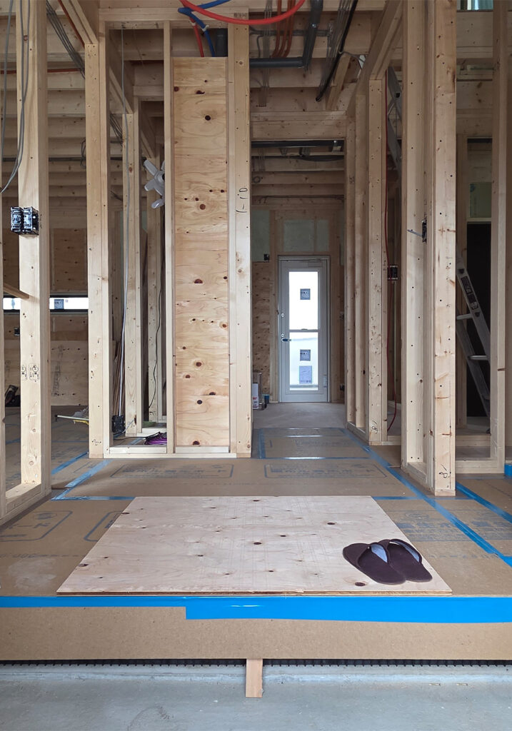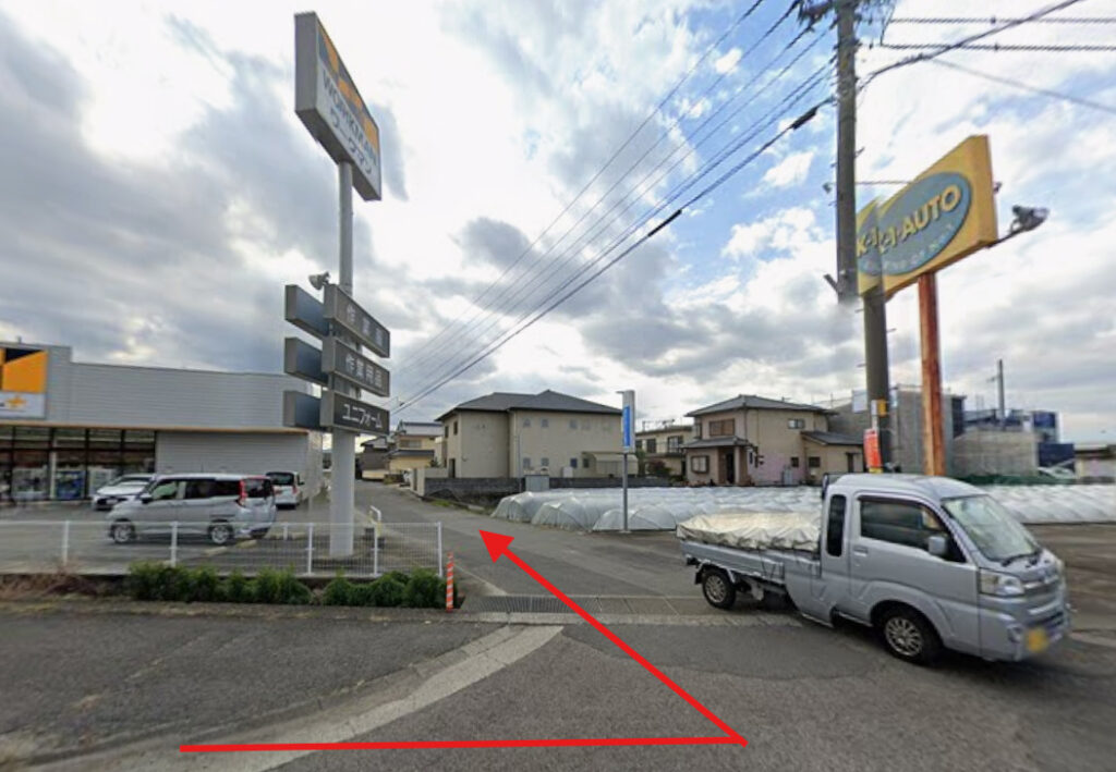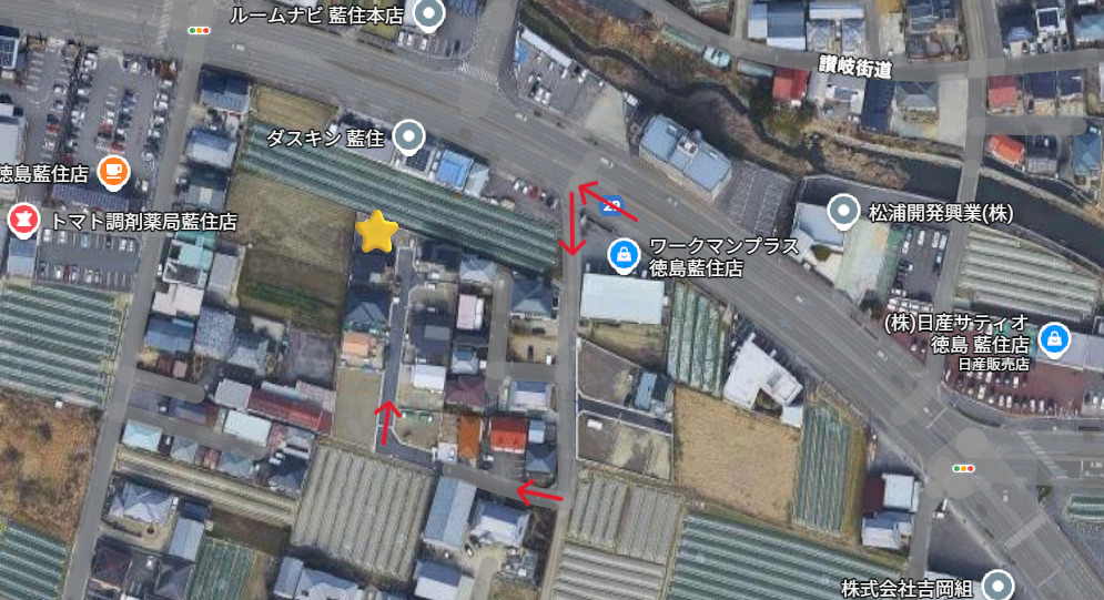 現地への目印はワークマンプラス徳島藍住店様。駐車場横の道へ入り、突き当りを右へ曲がると分譲地内へ。一番奥の☆印の場所で現在建築中です。