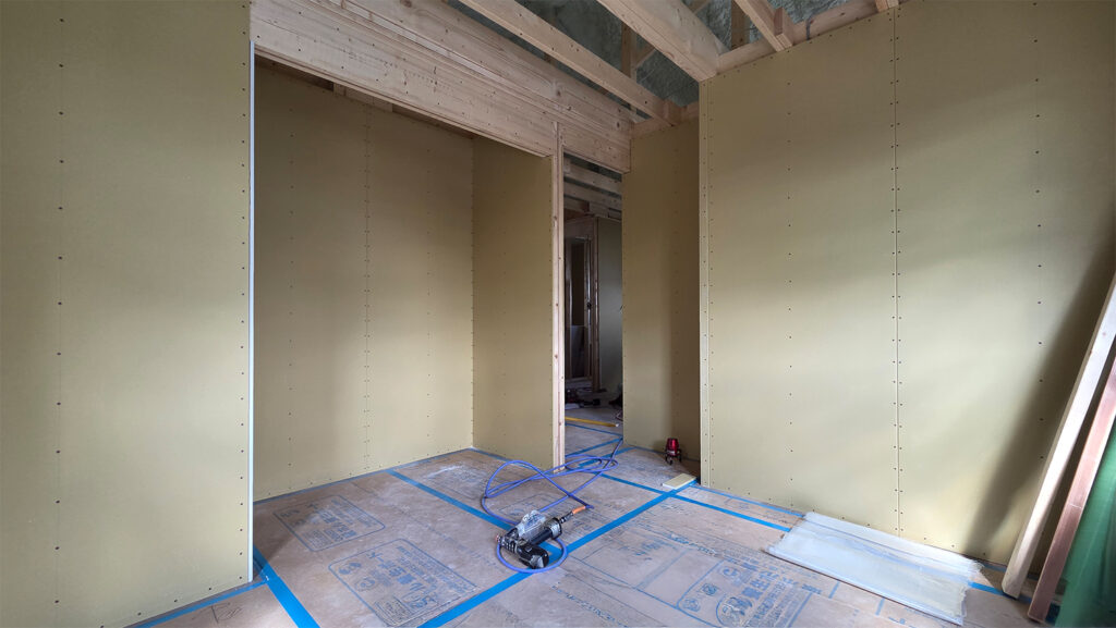 内部の方も、各部屋の壁に石膏ボードが貼られていき、間取りや部屋の大きさがだんだんとわかるようになってきてます。